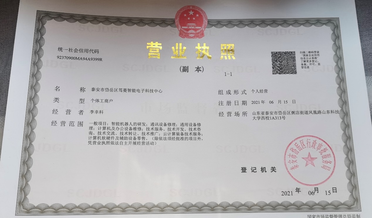 近日,智能装备学院学生李幸科于2021年6月15日注册笃凌智能电子科技公司。公司经营范围有:智能机器人的研发、通信设备的修理、计算机及办公设备的维修等。 学生在校注册公司是理论于实践相结合的体现,强化了创新创业的实践,展现了智能装备学院学子勇于突破、敢于创新、敢作敢为的精神风貌。(文/图:梁懿德)