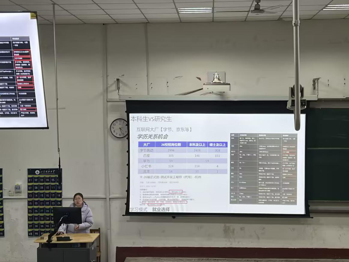分享会邀请大数据技术与工程专业两位优秀研究生代表刘颖超、孟莹洲担任主讲,围绕升学与职业规划主题,结合个人经历展开深度分享。在升学方面,两位同学系统介绍了院校与专业选择策略、复习阶段的时间安排以及复试准备要点等内容;针对就业方向,她们分享了项目经验积累、求职技能提升、实习与招聘信息获取等方面的实用建议,并共同强调职业规划应尽早起步、多方探索,在实践中动态调整、持续成长。互动环节中,现场同学踊跃提问,交流气氛热烈。