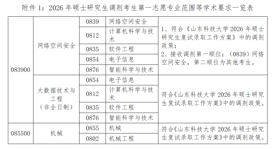 1、符合《山东科技大学2026年硕士研究生复试录取工作方案》中关于研究生调剂的相关政策和调入我院专业的报考条件。