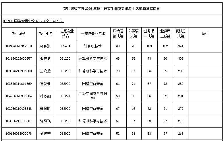 智能装备学院2026年硕士研究生调剂复试考生名单和基本信息