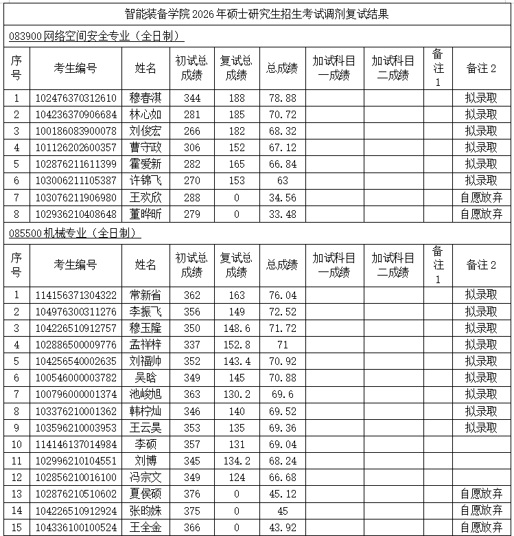 根据《山东科技大学2026年硕士研究生复试录取工作方案》《山东科技大学智能装备学院2026年硕士研究生复试录取工作实施细则》要求,我院组织完成2026年硕士研究生招生考试调剂复试,现将结果予以公示(名单附后)。