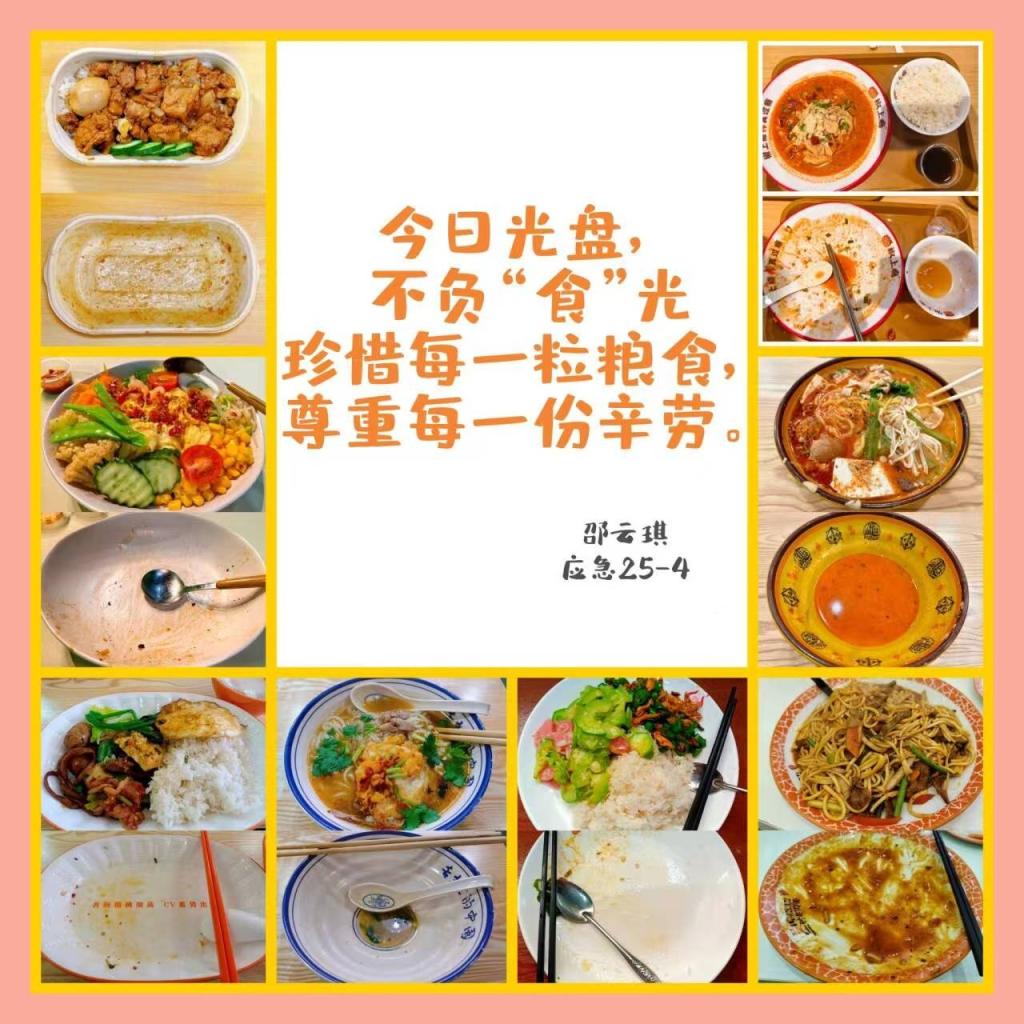 活动以“浪费为耻,节约为荣”为主题,让光盘行动真正走进校园,同学们积极响应,走进食堂,吃多少打多少,杜绝浪费,并拍下餐盘干净的照片,这些“光盘”展现了同学们践行节约、尊重劳动的风貌,并在校园形成一道节约的“风景线”。